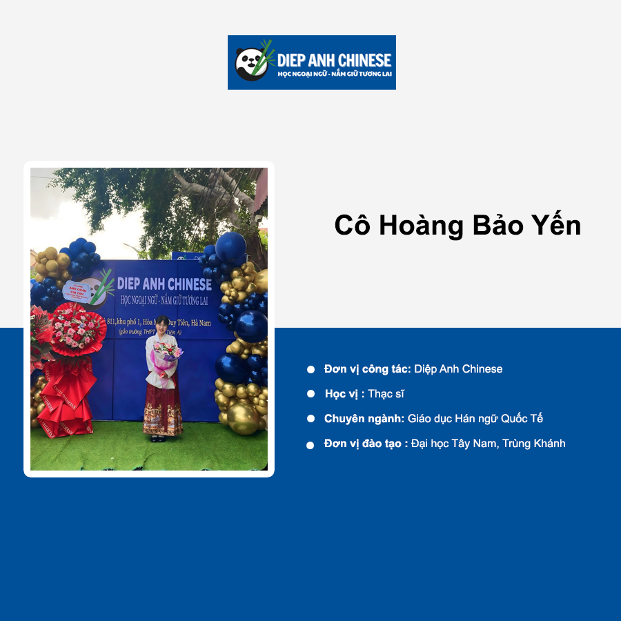 Giáo viên được tuyển chọn từ các trường Đại học ngoại ngữ trong và ngoài nước, kinh nghiệm giảng dạy nhiều năm, được đào tạo bài bản kỹ lưỡng sau khi được tuyển vào TRUNG TÂM NGOẠI NGỮ DIỆP ANH CHINESE